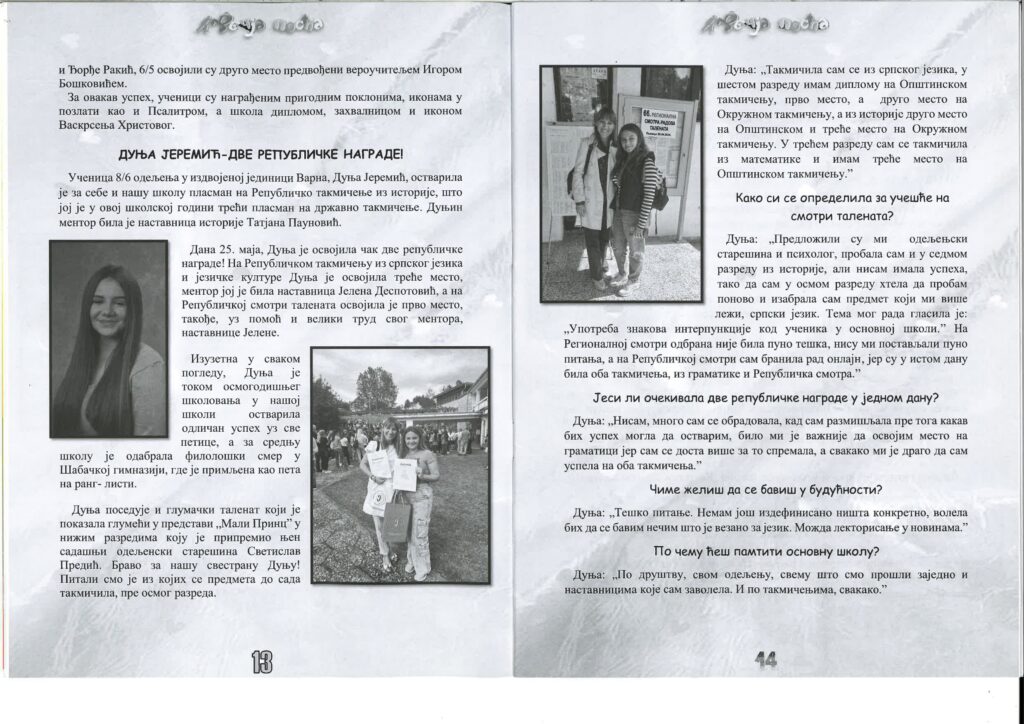 О Дуњи смо разговарали са Миланом Благојевићем, директором школе, Николом Танасићем, помоћником директора и наставником српског и Светиславом Предићем, наставником енглеског и разредним старешином Дуње Јеремић.